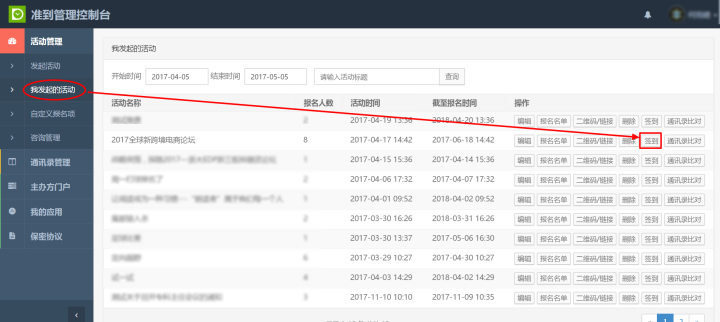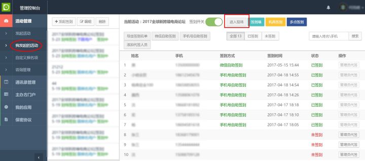 3. 配置完成后即可使用。“我发起的活动”→"签到"→"进入现场"→"消息上墙"选项→"大屏幕页面"