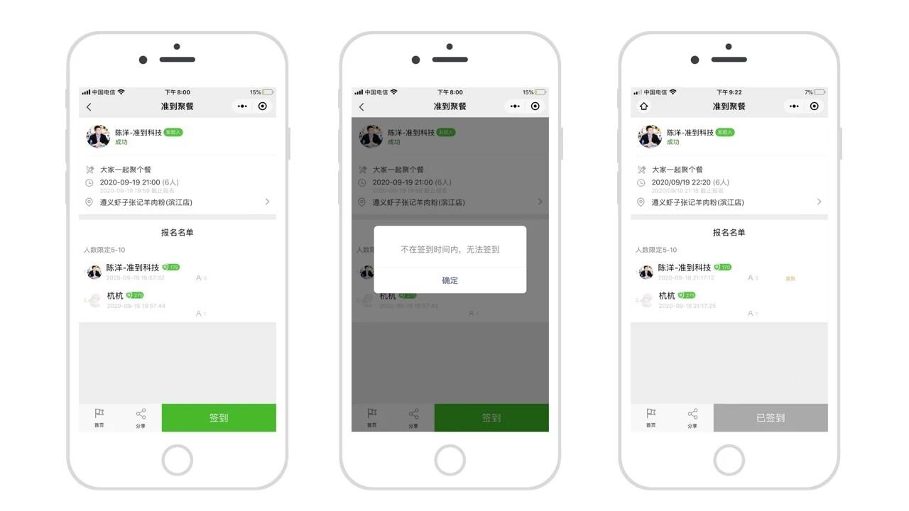 准到聚餐系统设置了信誉体系,目前每个人首次注册信誉值均为100分。在聚餐计划时间前后系统1小时内,签到功能自动启用,在聚餐地点500米范围内用户可自助完成签到,签到会有三种结果:准到(约定聚餐时间之前1小时内)、迟到(约定聚餐时间之后1小时内)、没到。最终本次聚餐活动系统会根据签到结果给予计分。对于信誉值较低用户系统会限制其后续组织和报名任何聚餐活动作为惩罚。