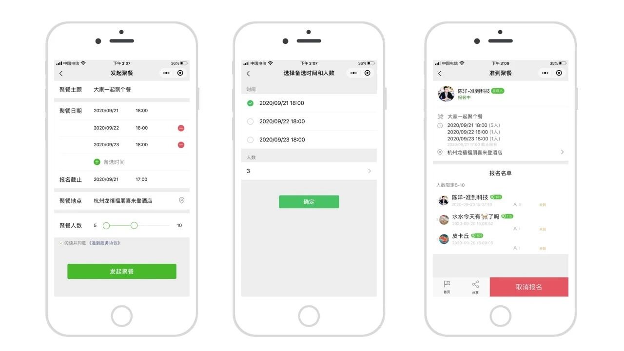 准到聚餐系统支持活动发起者设置1个时间或者多个聚餐可选时间。报名成功后,大家可以看到各个时间报名人数,选择人数最多的那个时间为最终聚餐时间。在报名时间截止前,用户可以取消报名,人数实时变化。