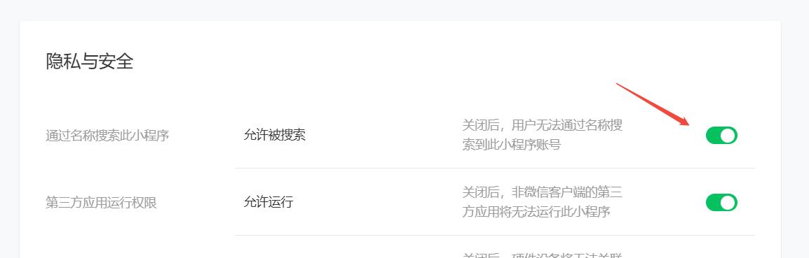 如何让微信小程序可以通过名称被搜索到 1、进入微信小程序平台 网址 https://mp.weixin.qq.com/ 登录系统 2、进入账号设置(如下图,准到活动管理系统小程序为例)- 隐私与安全- 通过名称搜索此小程序 开启即可。 文章标签: 通过名称搜索此小程序 允许被搜索 已解决 未解决 其它原因 »
